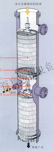 1、規(guī)整填料 2、支撐柵板 3、液體收集器 4、降液管 5、管式液體分布器 此結(jié)構(gòu)適合于直徑小于800mm的填料塔。 |